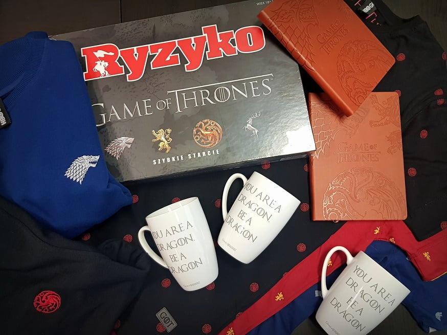 Miejsce 1: gra planszowa Ryzyko Gra o Tron + koc z motywem rodu + bluza z herbem + notes + kubek + koszulka z herbami
