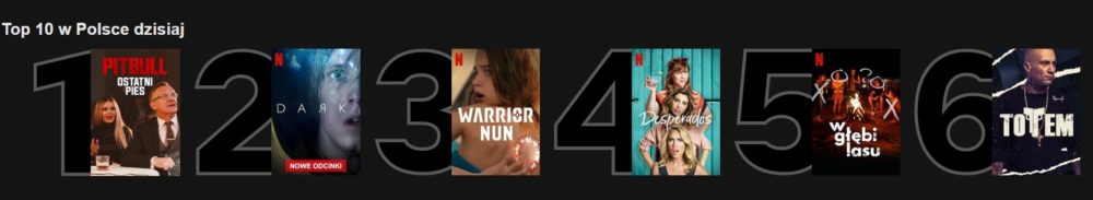 Wczoraj Pitbull. Ostatni pies wdrapał się na drugą pozycję, teraz zaś odebrał lidera serialowi Dark, który od kilku dni ma trzeci już sezon. Na trzeciej pozycji Warrior Nun, zaś W głębi lasu spada do pierwszej piątki.