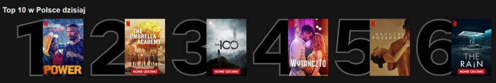 Mamy ostatnio dużo przetasowań na pierwszej lokacie. Tym razem fotel lidera przejął debiutant – film Power, pozbawiając tej pozycji The 100, strącone jeszcze na trzecie miejsce przez The Umbrella Academy.