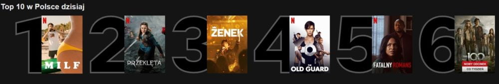 W dalszej części weekendu z pierwszą trójką pożegnało się The Old Guard. Tuż za MILF usadowił się debiutujący na platformie serial Przeklęta oraz Zenek. Warrior Nun spadło na sam koniec dziesiątki.