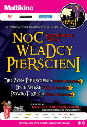 ENEMEF: NOC REŻYSERSKICH WERSJI WŁADCY PIERŚCIENI odbędzie się 28 czerwca jednocześnie w 30 Multikinach w Polsce: Bydgoszcz, Czechowice-Dziedzice, Elbląg, Gdańsk, Jaworzno, Katowice, Kielce, Koszalin, Kraków, Lublin, Łódź, Olsztyn, Poznań 51, Poznań Malta, Pruszków, Radom, Rumia, Rybnik, Rzeszów, Słupsk, Szczecin, Tychy, Warszawa Targówek, Warszawa Ursynów, Warszawa Wola, Warszawa Złote Tarasy, Włocławek, Wrocław Pasaż Grunwaldzki, Zabrze, Zgorzelec.