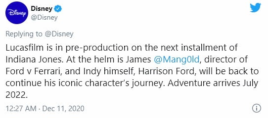 Podczas Dnia Inwestora Disneya, Kathleen Kennedy potwierdziła, że reżyser Logana, James Mangold rzeczywiście będzie na czele piątej części kultowej serii. Nie trzeba dodawać, że Harrison Ford powraca, by zagrać tytułowego bohatera, prawdopodobnie po raz ostatni.