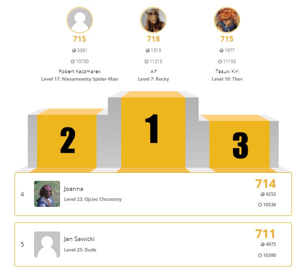 Zwycięzców prosimy o kontakt z Szymonem: [email protected]. W treści prosimy o informację o Waszej nazwie użytkownika oraz o zajętym miejscu w tabeli. Rekomendujemy również przesłanie danych swojego paczkomatu wraz z numerem telefonu.