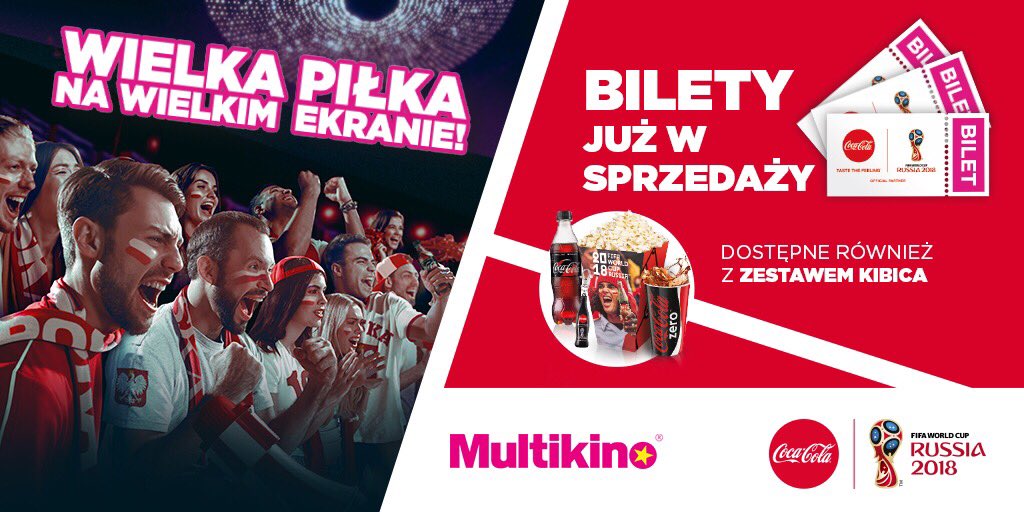 Wielki ekran, doskonała jakość dźwięku i obrazu, a do tego prawdziwe emocje i wrażenie, jakby uczestniczyło się osobiście w jednym z największych piłkarskich wydarzeń tego roku! Dzięki współpracy z firmą The Coca-Cola Company na ekrany Multikina wracają piłkarskie rozgrywki o tytuł najlepszego zespołu na świecie. Od 19 czerwca przeżyjemy emocje na najwyższym poziomie podczas spotkań Reprezentacji Polski, z kolei 15 lipca widzowie będą mieli okazję przekonać się, w czyje dłonie trafi puchar Mistrzostw Świata FIFA 2018.
