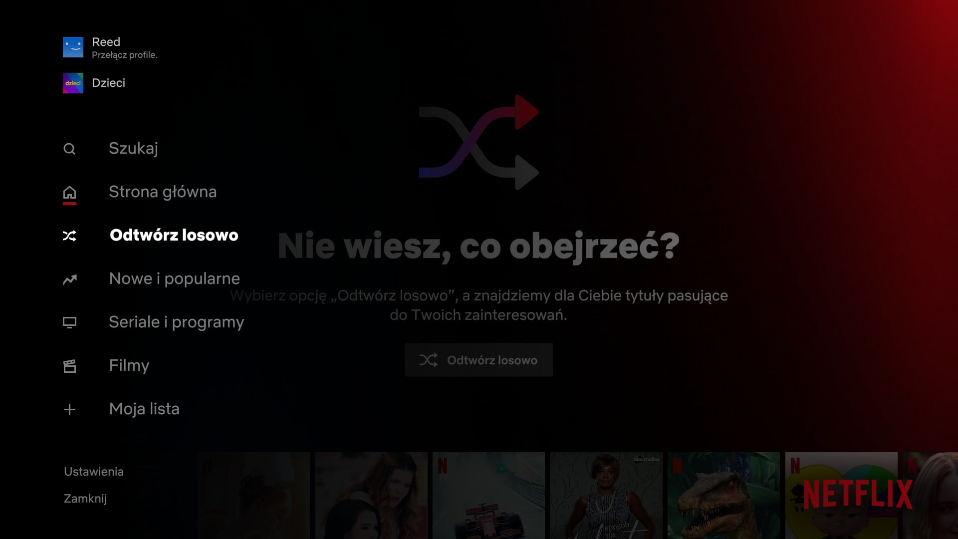 Wystarczy kliknąć “Odtwórz losowo”, aby zobaczyć nową propozycję filmu lub serialu. “Maszyna losująca” będzie wybierać tytuły na podstawie treści już wcześniej obejrzanych przez użytkownika, więc istnieje spore prawdopodobieństwo, że rekomendacja przypadnie mu do gustu. Jeżeli jednak pierwsza rekomendacja okaże się nietrafiona, Netflix przygotował plan B – Odtwórz coś innego. Wówczas poza nowościami może pojawić się propozycja włączonego wcześniej, ale niedokończonego filmu czy serialu lub jeden z tytułów z “Mojej listy”.