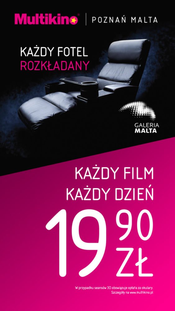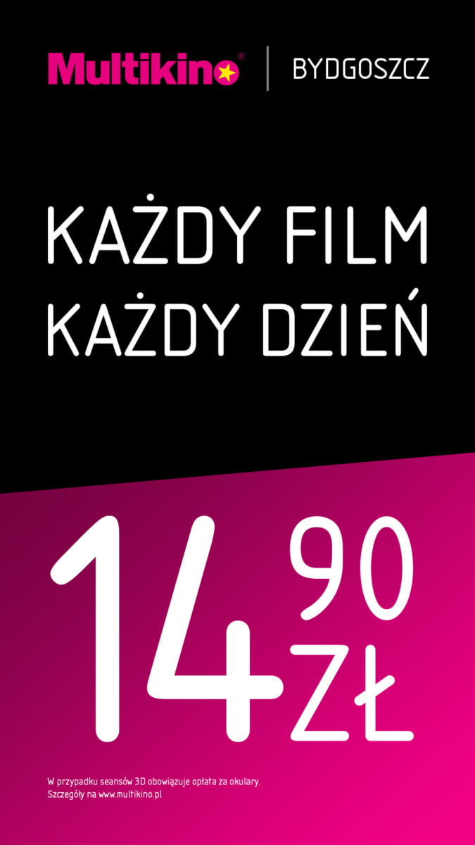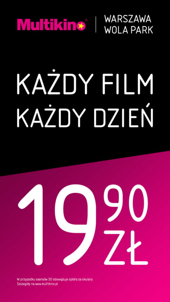Nowy cennik obowiązuje przez cały tydzień. Oznacza to, że od poniedziałku do niedzieli bilety do Multikina Warszawa Wola, Multikina Poznań Malta i Multikina Bydgoszcz mają tę samą, stałą cenę – czyli 19,90 zł. W przypadku seansów 3D wymagana jest dopłata za okulary.