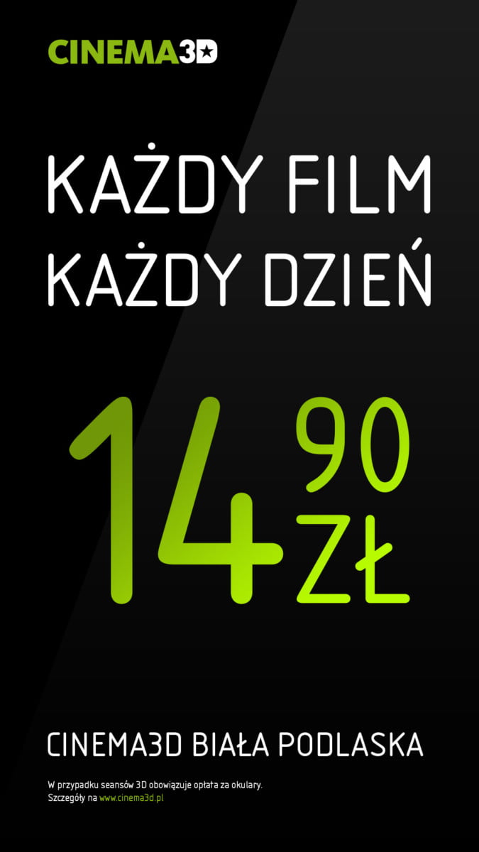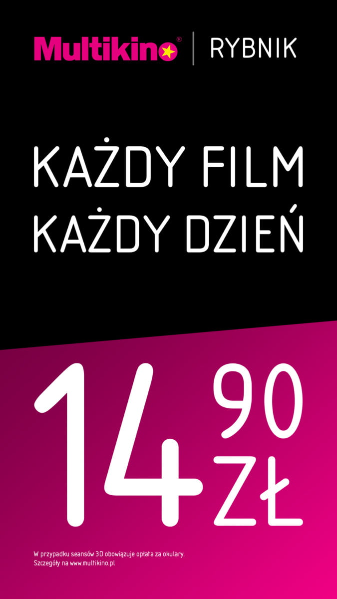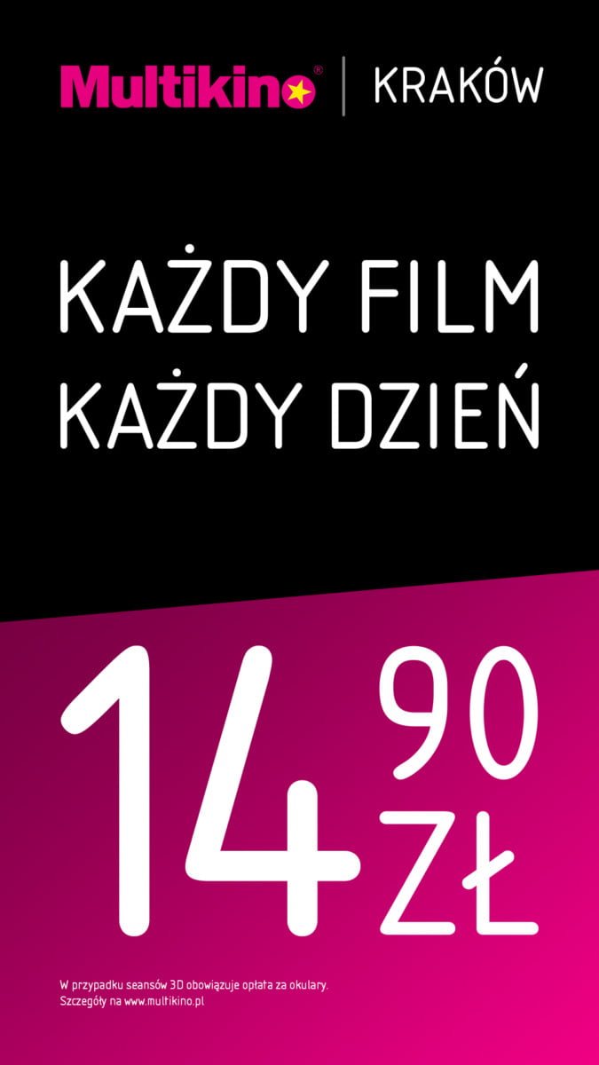 Nowy cennik obowiązuje przez cały tydzień. Oznacza to, że od poniedziałku do niedzieli bilety do Multikina Kraków, Multikina Rybnik i Cinema3D w Białej Podlaskiej w Galerii Rywal mają tę samą, stałą cenę – czyli 14,90 zł. W przypadku seansów 3D wymagana jest dopłata za okulary.
