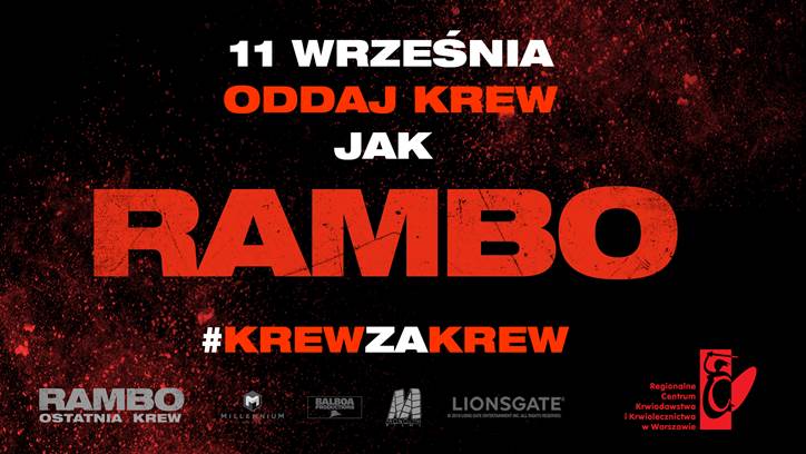 Monolith Films oraz Regionalne Centrum Krwiodawstwa i Krwiolecznictwa w Warszawie zapraszają do wzięcia udziału w akcji krwiodawstwa Krew za krew! Z okazji zbliżającej się premiery najnowszej części przygód Johna Rambo, zachęcamy wszystkich do zaangażowania się w akcję i zrobienia czegoś dobrego dla innych.
