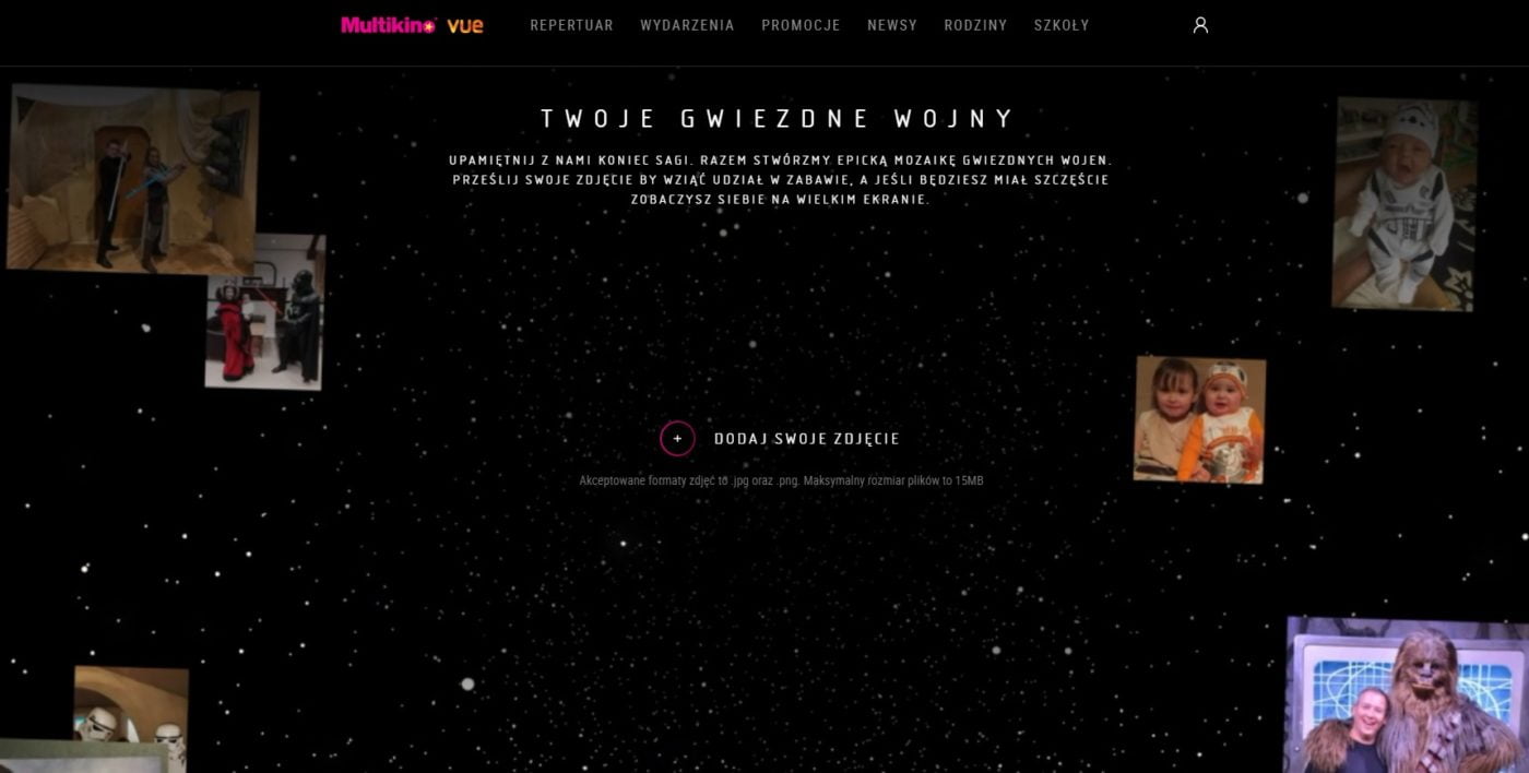 Wystarczy wejść na stronę http://starwarsmemories.multikino.pl/ i przesłać swoje zdjęcie. Z udostępnionych fotografii powstanie epicka mozaika, którą Multikino pokaże przed seansami filmu „Gwiezdne wojny: Skywalker. Odrodzenie”. Każdy kto wyśle zdjęcie będzie miał szansę zobaczyć siebie na wielkim ekranie.