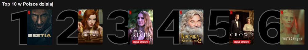 Mamy dość zaskakującego lidera w zestawieniu. Gambit królowej nie cieszył się długo prowadzeniem, które o dziwo odebrał mu włoski film akcji. Tymczasem Virgin River wdrapało się na trzecią lokatę, a The Crown i Erotica 2022 spadły i znacząco się oddaliły od podium.