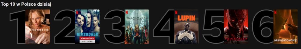 Dziś było trochę roszad na szczycie listy. Przede wszystkim Przeznaczenie: Saga Winx padło na ostatnie miejsce podium, a Lupin z niego w ogóle wyleciał. Na czoło wysunął się Prokurator, a za nim powracające do dziesiątki Riverdale. Na piątej pozycji czyha tymczasem Brightburn, kończąc tym samym bezkrólewie w głównej dziesiątce.