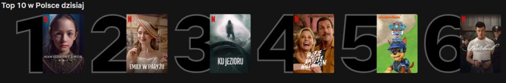 Od ostatniego zestawienia podium nie uległo zmianie, co oznacza, że Nawiedzony dwór w Bly w dalszym ciągu zajmuje pierwszą pozycję przed Emily w Paryżu. Tuż przed filmem Adama Sandlera zaś trzyma się Ku jezioru.