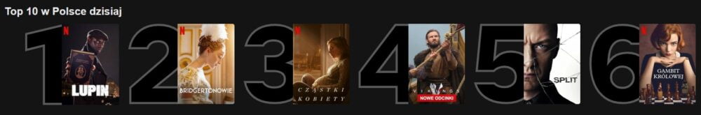 Jeżeli chodzi o pierwszą czwórkę zestawienia, dziś tylko Bridgertonowie i Cząstki kobiety zamienili się miejscami. Na piątą pozycję zaś wskoczył Split z Jamesem McAvoyem.