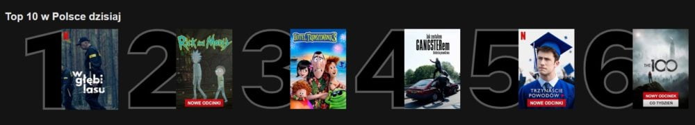 Weekend w toku i całkiem sporo przewrotów na liście. Startujące na platformie Netflix W głębi lasu natychmiast wskakuje na pierwszą pozycję. Będący zaś liderem od dobrych kilku dni Jak zostałem gangsterem. Historia prawdziwa zsunął się aż na miejsce czwarte. Rozbiły go dwie animacje: Rick i Morty oraz Hotel Transylwania 3. Z zestawieniem głównym pożegnało się zaś sporo tytułów, w tym Dynastia.