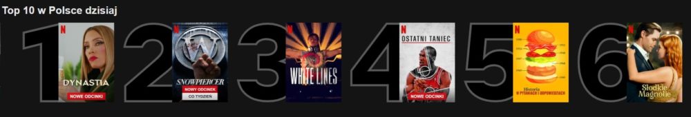 Nowy serial Netfliksa bazujący na powieści graficznej zyskuje coraz większą popularność. Tym razem wskoczył już na drugi stopniu podium, tuż za Dynastię, zrzucając zeń tym samym Ostatni taniec, a White Lines na trzecią pozycję. Niemal cała druga połowa dziesiątki nadal okupowana jest z kolei przez filmy o Harrym Potterze.