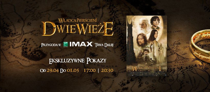 Najsłynniejsza trylogia w dziejach kina i największe ekrany w Polsce – tak 20.rocznicę Władcy Pierścieni świętuje Cinema City. Od 29 kwietnia do 1 maja premierowo w technologii IMAX pokazane zostaną Dwie Wieże– druga część trylogii. Na ponad 315 metrach kwadratowych ekranu i z wyjątkowymi efektami dźwiękowymi fani LOTR po raz pierwszy będą mogli zobaczyć bitwę pod Helmowym Jarem, uznawaną przez wielu za najbardziej widowiskową scenę walk w historii kina.