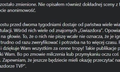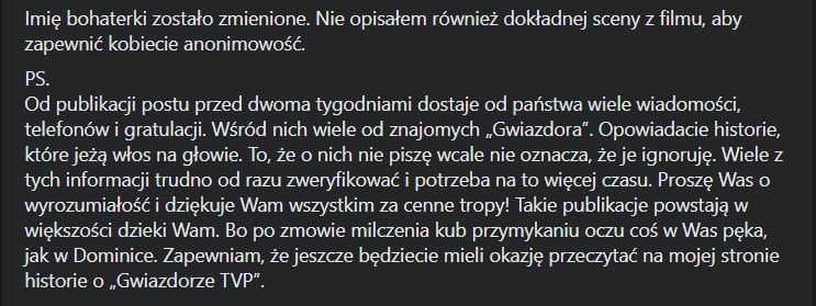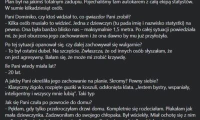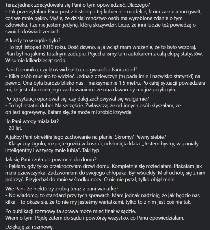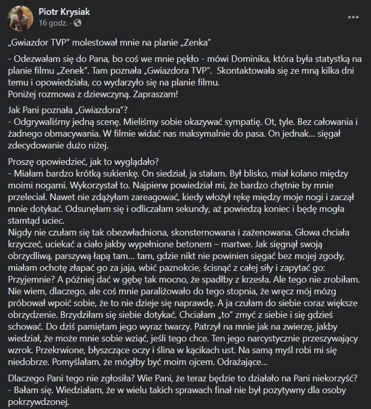 Do Piotra Krysiaka, który opublikował pierwsze wspomniane oskarżenia, zgłosiła się statystka z filmu o Martyniuku. Dziennikarz śledczy opublikował na Facebooku zapis rozmowy z ową anonimową kobietą. Oględnie mówiąc, wynika z niej jednoznacznie, że „gwiazdor TVP” miał ją napastować, co rzekomo widziała również inna statystka. Oto pełen zapis: