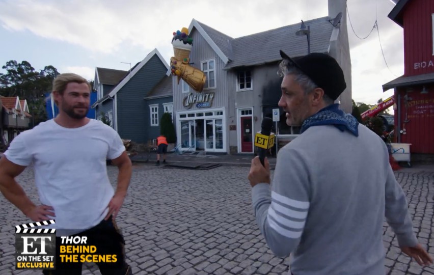 Podczas oprowadzania fanów po Nowym Asgardzie widzimy kilka naprawdę ciekawych miejsc. W tym oczywiście rzuca się w oczy zwłaszcza jedno miejsce – Infinity Comez. Miejsca z lodami nawiązuje oczywiście do Thanosa i rękawicy nieskończoności.