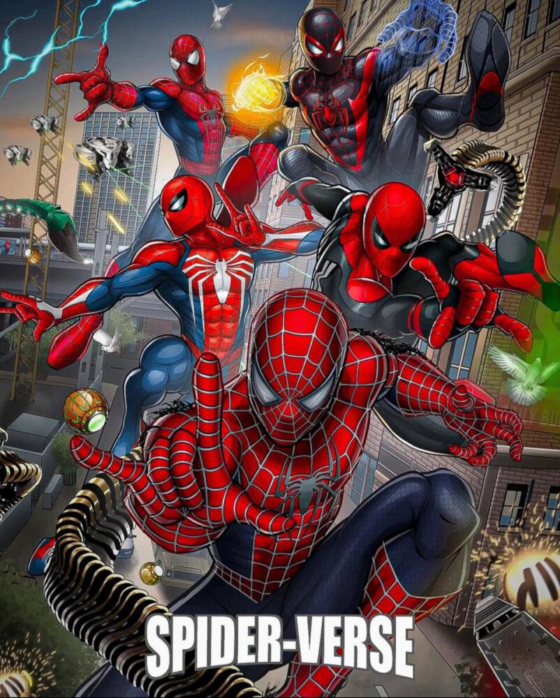 Użytkownik Justar Sketches, zajmujący się na co dzień tego typu grafikami postanowił zaprezentować na swoim plakacie właśnie Spider-Verse. Mamy tutaj Spider-Mana w wersji granej przez Toma Hollanda, Tobeya Maguire’a i Andrew Garfielda, a także Milesa Moralesa oraz wersję Petera Parkera znaną z gry na Play Station.