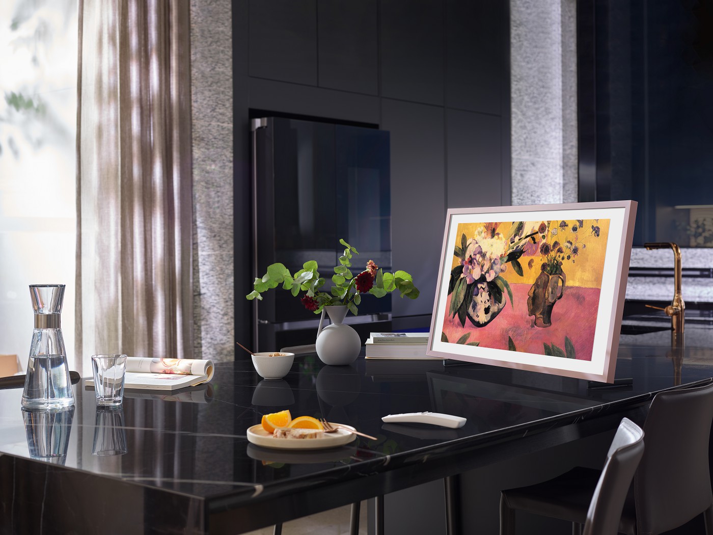 W drugiej opcji The Frame można także postawić i powiesić w orientacji pionowej. Uchwyt Przylegający dostępny w zestawie pozwala na szybką i prostą instalację telewizora na ścianie wśród innych naszych ulubionych dzieł sztuki. Ekran można odchylać na boki, do tyłu lub do przodu, by wyglądał jak prawdziwy obraz w galerii. Jego położenie możemy zmieniać w zależności od tego, czy chcemy akurat obejrzeć film czy np. malarstwo portretowe i zdjęcia z naszego smartfona.