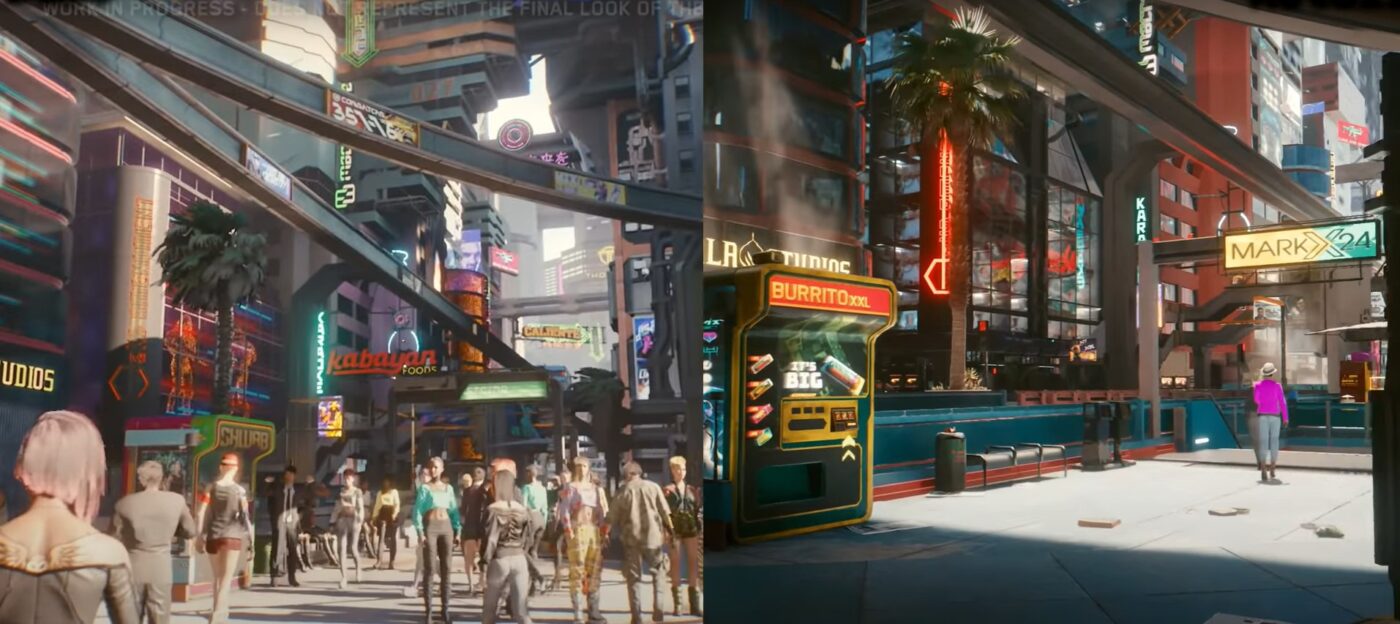 NA Youtube pojawiło się specjalne wideo porównujące materiały promocyjne z E3 sprzed dwóch lat z właściwą wersją gry, włączonej na Geforce RTX 3080. I trzeba przyznać, że CD Projekt Red znakomicie rozwinęli pewne aspekty rozgrywki. Przede wszystkim warto zwrócić uwagę na rozwinięcie poziomu detali: