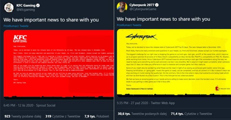 Styl wiadomości jest podobny do tego, jakim posługiwało się do tej pory CD PROJEKT RED przy okazji przekładania dat premiery swojej gry. Poniżej można zobaczyć, jak wygląda wymiana tweetów pomiędzy firmami.