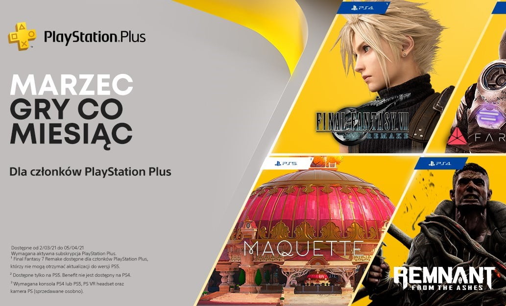 Prezentujemy marcową ofertę subskrypcji PlayStation Plus. Na wszystkie osoby posiadające aktywne członkostwo czekają aż cztery tytuły: Final Fantasy 7 Remake, Remnant: From the Ashes, Farpoint i Maquette, czyli nowa wersja jednej z najpopularniejszych serii gier, kooperacyjna gra akcji, tytuł w pełni wykorzystujący moc VR Aim Controllera.