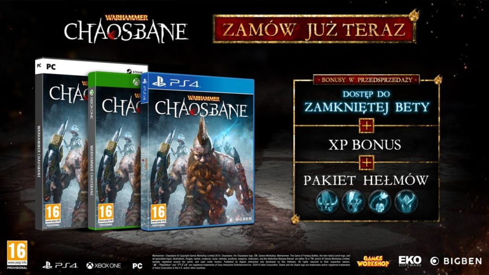 Warhammer: Chaosbane będzie dostępny na PlayStation 4, Xbox One i PC od 4 czerwca 2019 roku. Gra umożliwia rozgrywkę solową albo z udziałem 4 graczy w trybie lokalnym i online, a mechanizm uzupełniania się klas oraz interfejs zostały zaprojektowane specjalnie pod kątem trybu współpracy. Preordery dostępne są już w najlepszych sklepach z grami.