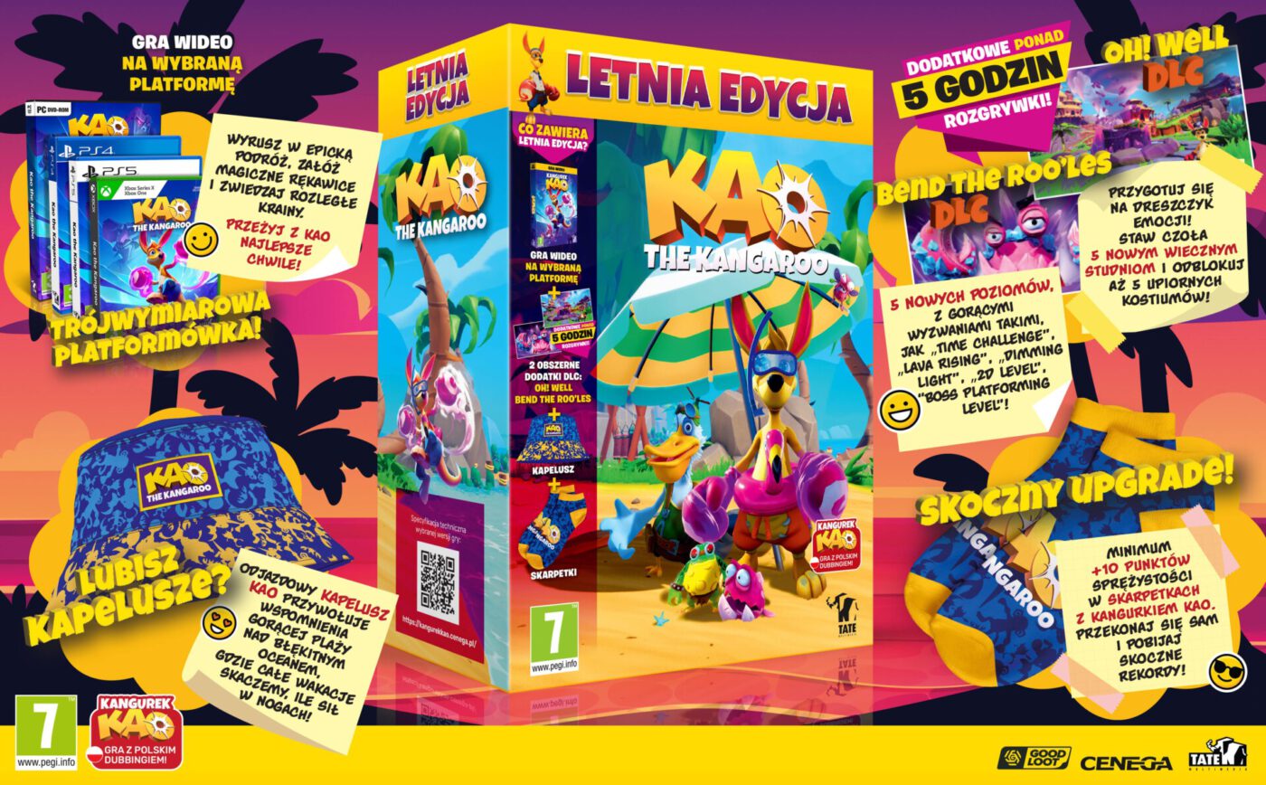 Cenega, oficjalny partner Tate Multimedia, w Polsce, Czechach, na Słowacji oraz na Węgrzech ma przyjemność ogłosić, że dzisiaj premierę ma wyjątkowa Edycja Letnia gry Kangurek Kao. Poza samą grą zestaw zawiera też dodatkowe gadżety w sam raz na wakacyjne przygody. Edycja Letnia Kangurka Kao dostępna jest na konsole PS5, PS4, Xbox One/Xbox Series X oraz PC w pełnej polskiej wersji językowej z dubbingiem.