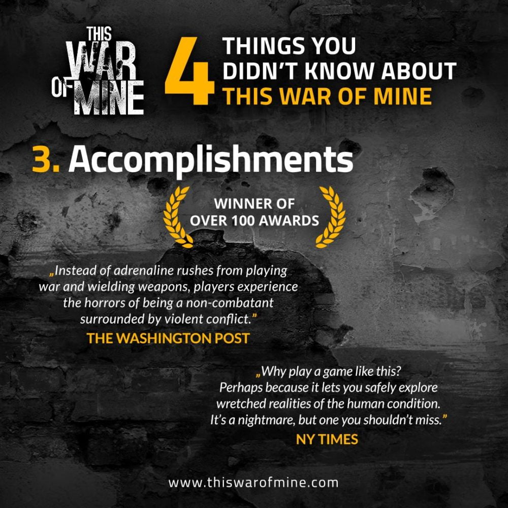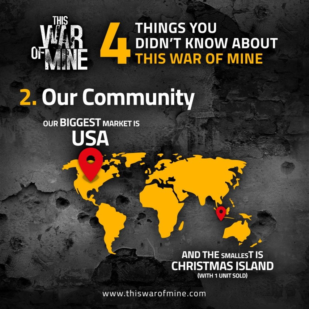 Od premiery This War of Mine minęło już przeszło cztery lata. Jak dowiadujemy się z udostępnionych infografik produkcja 11 bit studios sprzedała się w nakładzie ponad 4,5 miliona egzemplarzy. Studio wykazało się również niesamowitą szczodrością przekazując ponad pół miliona dolarów na rzecz organizacji charytatywnej War Child. Oprócz tego dowiemy się także na jakim rynku gra odniosła największy sukces, a także gdzie sprzedano tylko jedną kopię… Z infografikami możecie zapoznać się poniżej.