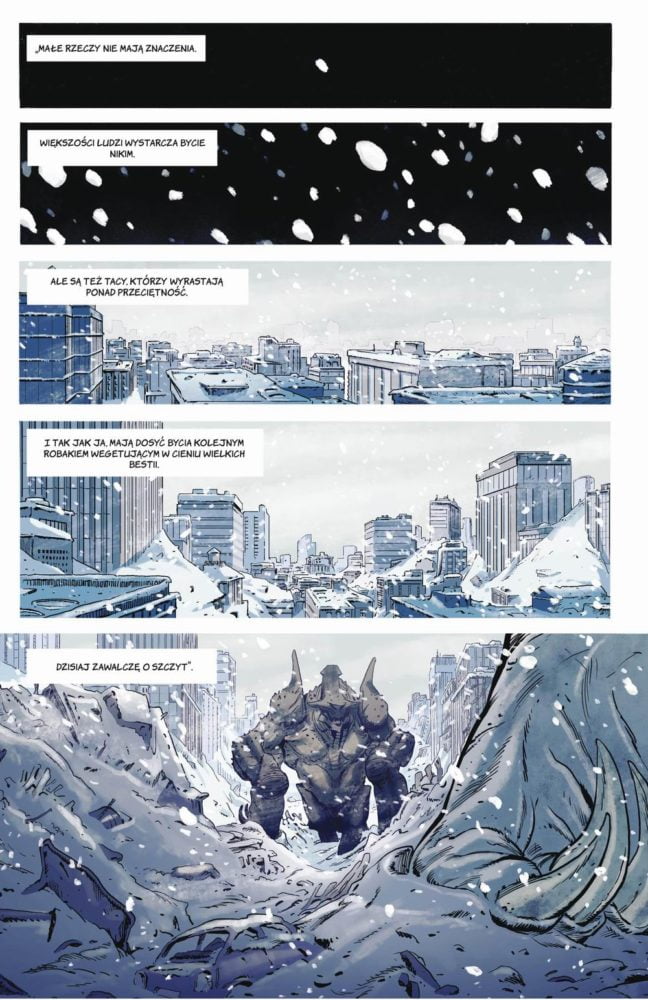 Prawdziwie ciekawe rzeczy dzieją się tutaj jednak na poziomie grafiki. Ogółem kreska stanęła gdzieś między komiksem zachodnim a mangą: mamy charakterystyczną dla japońskiego komiksu plastyczność kadrów, płynność narracji i lekkie dysproporcje postaci, a jednocześnie całość utrzymana jest w barwnym, pełnym akcji stylu amerykańskiej historii w obrazkach. Projekt gigantycznych bestii też jest czymś nowym – w posłowiu możemy wyczytać, że autorzy starali się, by nie nawiązywały do znanych potworów z filmów. Rysownik, Miguel Valderrama, stworzył też dwa plany opowieści, różniące się sposobem rysunku i kolorystyką. Podziemne miasto utrzymane jest w ciemnych barwach, z naciskiem na czernie i czerwienie, kadry są niewielkie, a rysunki na nich to raczej zbliżenia i detale. Z kolei akcja na powierzchni przedstawiana jest w bielach, błękitach i szarościach, często panoramicznie lub na dużych kadrach. Doskonale wpisuje się to w narrację Giants: różne plany odpowiadają różnym wątkom i nacechowaniu opowieści, podkreślając dodatkowo wydarzenia ważne fabularnie.