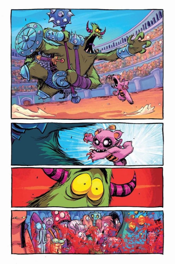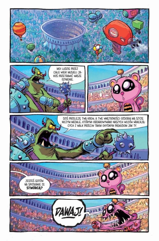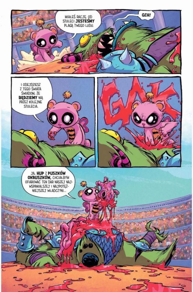 Skottie Young znany jest ze swej „bajkowej” kreski, która przy całej swej uroczej otoczce zaskakuje przekazem. Dostajemy tu odrobinę mangi, i to w nie byle jakich okolicznościach. Oto Gert dane jest zaprezentować się w tym, co robi najlepiej, czyli brutalnej walce. Przyznam, że to mój ulubiony fragment tego tomu, łączący w sobie osobistą nostalgię do starych dobrych bijatyk i anime. Przez chwilę mamy też okazję oglądać nieco inną wersję Gert, jakże kojarzącą mi się z pewnym kultowym mutantem Marvela.