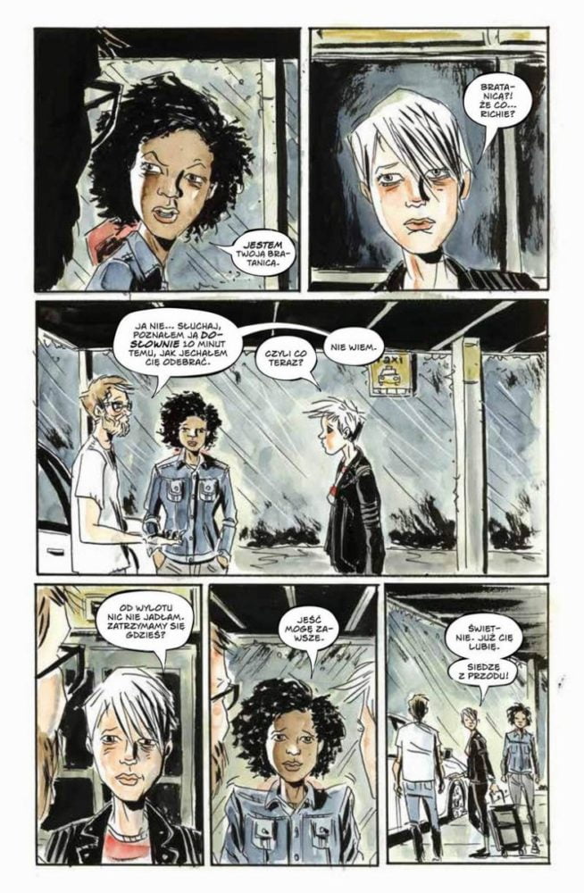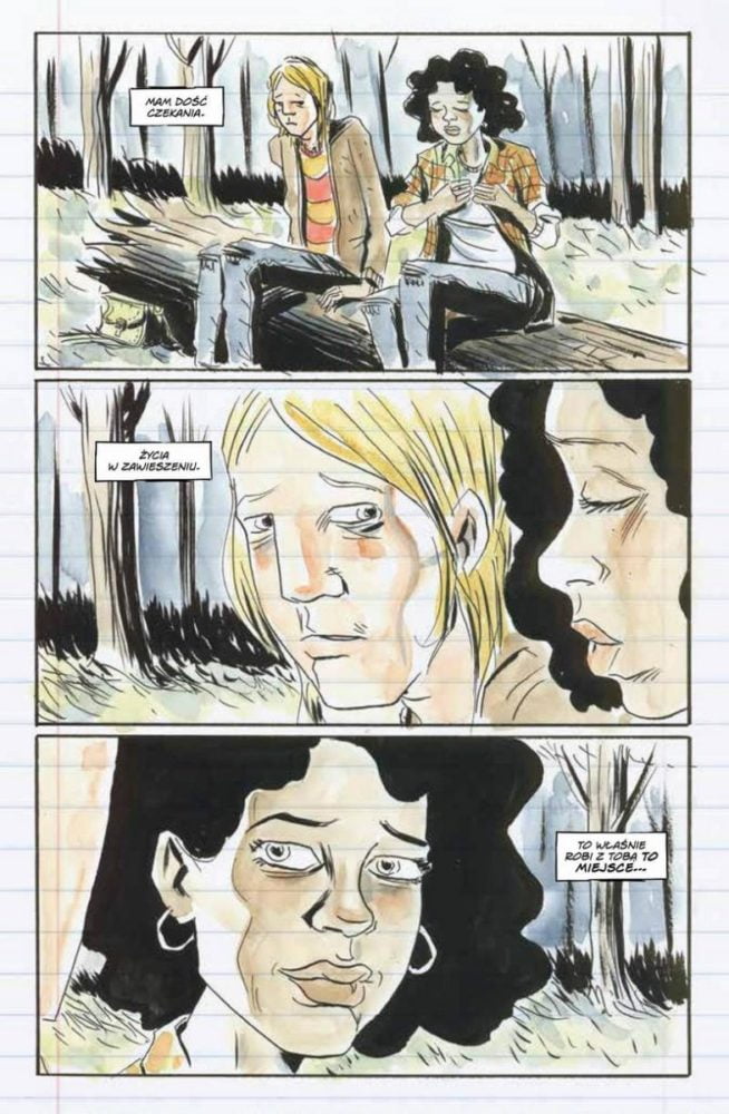 Na łamach niezliczonych komiksów miasta odgrywały ważną rolę. Gotham czy Mega City-One to najlepsze tego przykłady. Royal City to przy nich najgłębsza prowincja, lecz Jeff Lemire swoimi rysunkami sprawia, że klimat tej mieściny jest niezapomniany. Bo cóż z tego, że akcja ma miejsce w Stanach Zjednoczonych? Czy i u nas nie ma uginających się pod presją zmian byłych ośrodków przemysłowych średniego kalibru? Prace Lemire’a perfekcyjnie oddają ich klimat. Miniona chwała pokrywająca się kurzem i otępieniem, atmosfera pułapki i mieszkańcy jakby czekający na powrót dawnych dni. Czytając zarówno Royal City tom 3: Płyniemy z prądem, jak i poprzednie tomy, wpatrywałem się w niektóre kadry, które wydawały mi się niestety nader znajome.