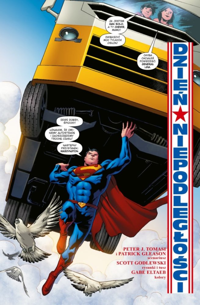 Pierwsza część tomu to laurka dla poprawnego pojmowania USA i wartości zachodniej cywilizacji. Kentowie ruszają w podróż, podczas której Jon ma okazję zdobyć nie tylko sporo wiedzy, ale i poznaje zasady, które bliskie są jego ojcu. Słowem – cała ta edukacja ma kolor Gwieździstego Sztandaru, którym dodatkowo wymachuje Wuj Sam i przypuszczam, że gdyby Kapitan Ameryka przeczytał tę część albumu, zalałby się łzami szczęścia. Czego tu nie ma! Tomasi opowiada o męstwie, bohaterstwie, poświęceniu, ale też o tolerancji i koegzystencji odmiennych grup etnicznych. Zarówno lewica, jak i prawica będą zadowolone, co wydaje się nieco niemożliwe. Ale w końcu nie ma zadania, któremu nie podołałby Superman. I nie ma w tym cienia ironii. Idea Supermana, mimo swej fikcyjności i naiwności, w pewien sposób łączy w sobie wartości, które wyznają zwolennicy obu stron społeczeństwa. Jednocześnie wszystko to jest esencją stylu Tomasiego.