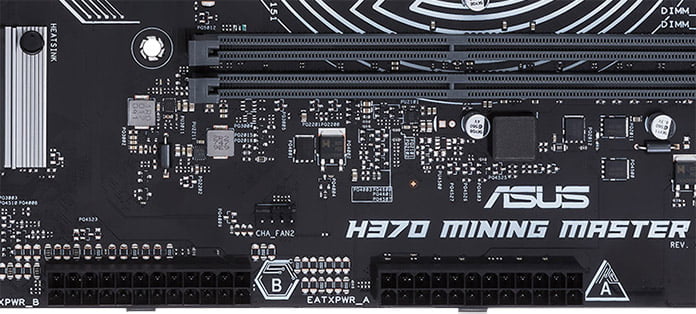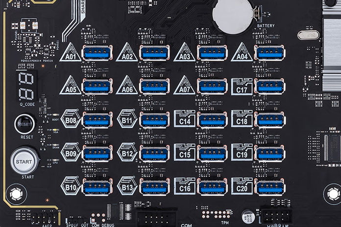 Asus H370 posiada 20 pionowych złączy USB 3.1 Gen 1 połączonych bezpośrednio pod ścieżki PCIe. Po co? Dzięki temu jedna płyta główna jest wstanie obsłużyć do 20 kart graficznych. Co więcej upraszcza to montaż każdej z nich. GPU wykorzystywane do kopania pracuje 24/7 na pełnych obrotach i wymaga odpowiednio dużo wolnej przestrzeni by zamontowane na nich układy chłodzenia działały prawidłowo. W tym celu używa się kart riser, które z jednej strony mają złącze PCIe x16, a z drugiej PCIe x1, całość połączona jest kablem USB.