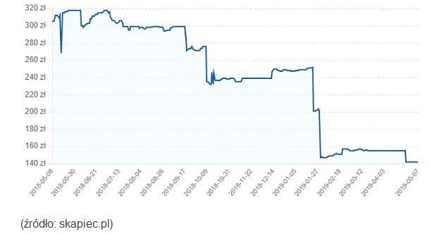 Cena. Kilka lat temu, gdy dyski SSD dopiero wchodziły na rynek, dla wielu użytkowników były one nieosiągalne cenowo. W ostatnich latach, a szczególnie w ostatnim roku, ceny nośników półprzewodnikowych uległy znacznej obniżce, a różnica w tej kwestii między HDD a SSD wyraźnie zmalała. Poniższy wykres pokazuje zmiany ceny dysku Plextor M8V(G) w wersji 256 GB na przestrzeni ostatnich 12 miesięcy. Jak widzimy, na przestrzeni roku spadła ona o ponad 50 procent.