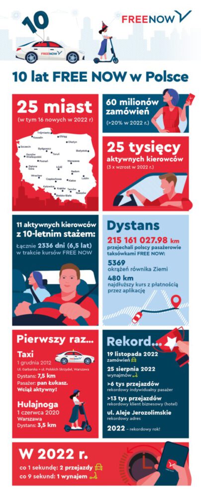 1 grudnia 2012 roku w Polsce wystartowała pierwsza na świecie aplikacja do zamawiania taksówek – FREE NOW (wówczas pod nazwą mytaxi). Od tego czasu rynek mobilności miejskiej przeszedł prawdziwą rewolucję, zarówno pod kątem preferencji użytkowników co do sposobu zamawiania przejazdów, jak i sposobów płatności mobilnych. Obecnie, platforma FREE NOW w Polsce w szczytowych godzinach rejestruje dwa przejazdy taxi na sekundę oraz wynajem hulajnogi co dziewięć sekund. W 2023 FREE NOW planuje dodać kolejne usługi.