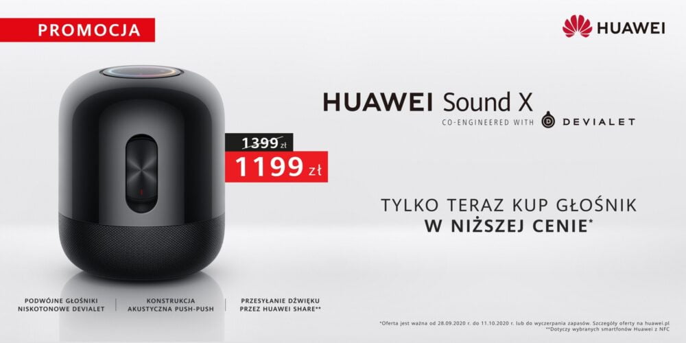 Huawei Sound X, inteligentny głośnik stworzony we współpracy z firmą Devialet, jednym z najbardziej cenionych na świecie producentów sprzętu audio, dostępny jest teraz w nowej, atrakcyjnej cenie – 1199 zł. Oferta potrwa od 28 września do 11 października.