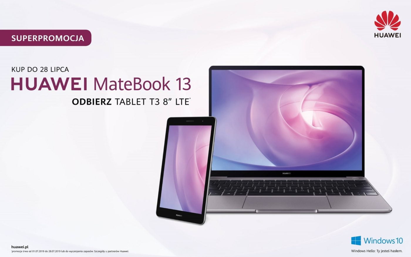 Huawei kusi kolejną, atrakcyjną promocją. Każdy, kto kupi wysokiej jakości laptop Huawei MateBook 13 (w dowolnej konfiguracji) otrzyma dodatkowo w zestawie tablet Huawei MediaPad T3 8” LTE. Oferta obowiązuje od 1 lipca do 28 lipca lub do wyczerpania zapasów.