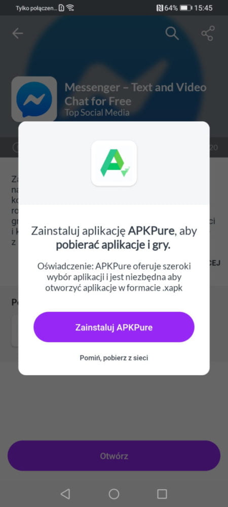 W wyszukiwarce wpisujemy nazwę aplikacji, którą chcemy zainstalować na naszym smartfonie, a następnie wybieramy źródło, z którego chcemy pobrać aplikację np. APKPure i instalujemy je.