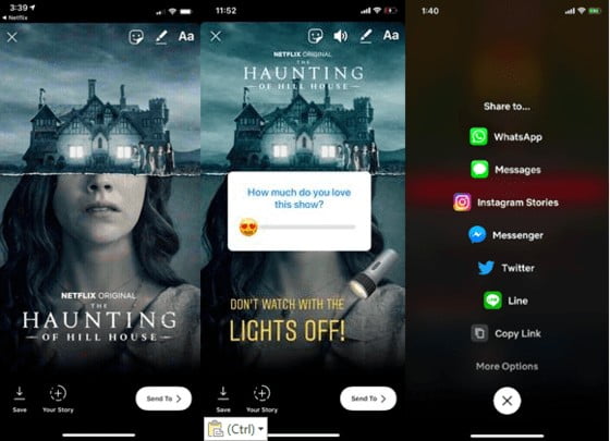 By stworzyć takie InstaStory, wystarczy przejść do aplikacji Netflix, wybrać serial, film lub inny program, który nas interesuje i kliknąć opcję „Udostępnij”. Użytkownik zobaczy okno z listą serwisów social media – także Instastory. Po wybraniu tej opcji, aplikacja przełącza się bezpośrednio na Instagram, gdzie można dodać niestandardową grafikę lub tekst do swojej historii i wysłać ją jednemu lub kilku znajomym, zachęcając ich do sprawdzenia danych treści.