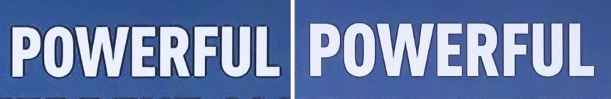 Podczas odtwarzania wideo o niskiej rozdzielczości na ekranie, którego rozdzielczość jest wysoka, „szumy” linii (zaburzenia transmisji, które zacierają szczegóły i powodują niepożądane cyfrowe zakłócenia statyczne) są najbardziej uciążliwym efektem. Ponieważ obrazy wejściowe mają niższą jakość, kontury liter stają się niewyraźne. Jednak 8K AI Upscaling inteligentnie poprawia grube i nierówne kontury, tak aby stały się maksymalnie wyostrzone, zapewniając wyraźniejsze litery, odpowiednie do wrażeń, jakich oczekujemy podczas oglądania telewizji wysokiej rozdzielczości. Ten aspekt upscalingu ma zasadnicze znaczenie dla widzów, ponieważ poprawia czytelność tekstu (co widać na powyższych obrazach) i zmniejsza zmęczenie oczu.