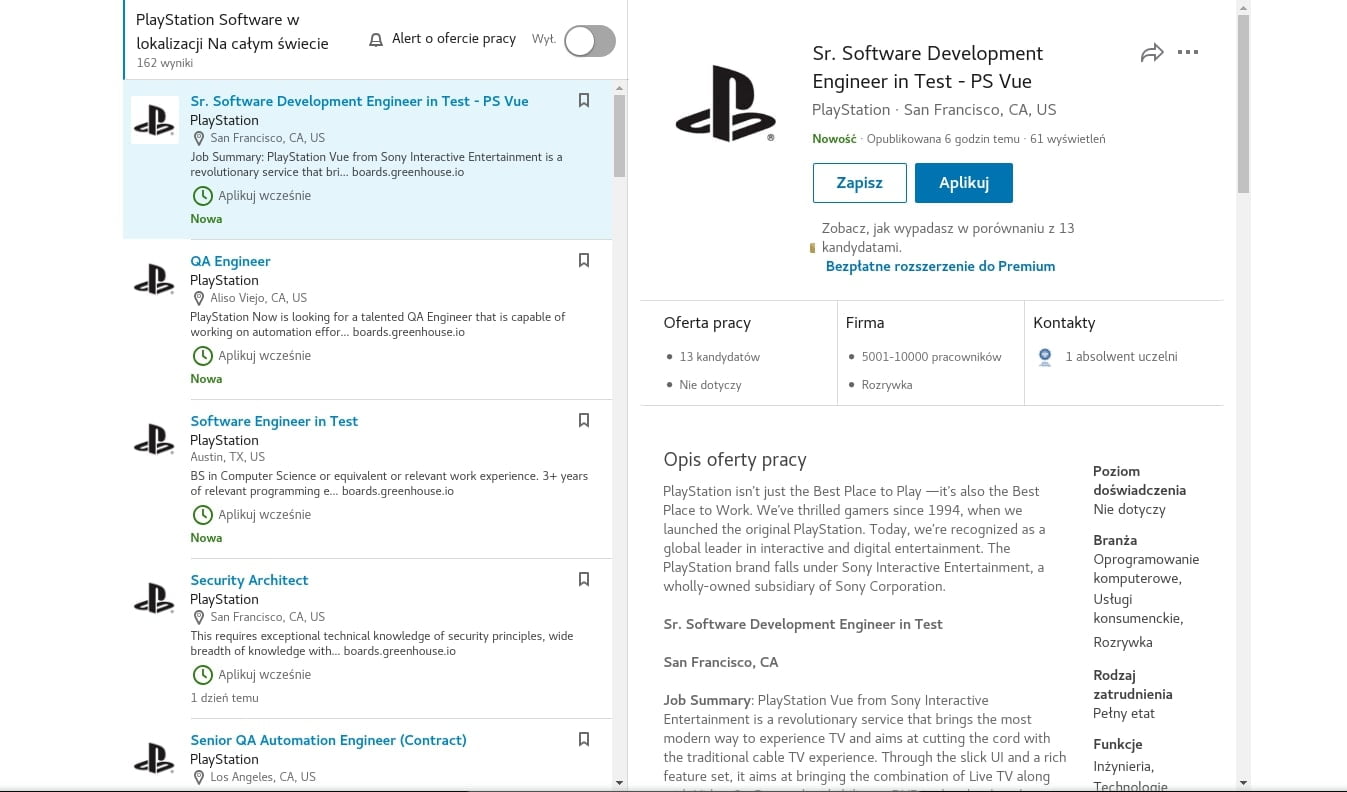 najnowsze oferty pracy w Sony, LinkedIn
