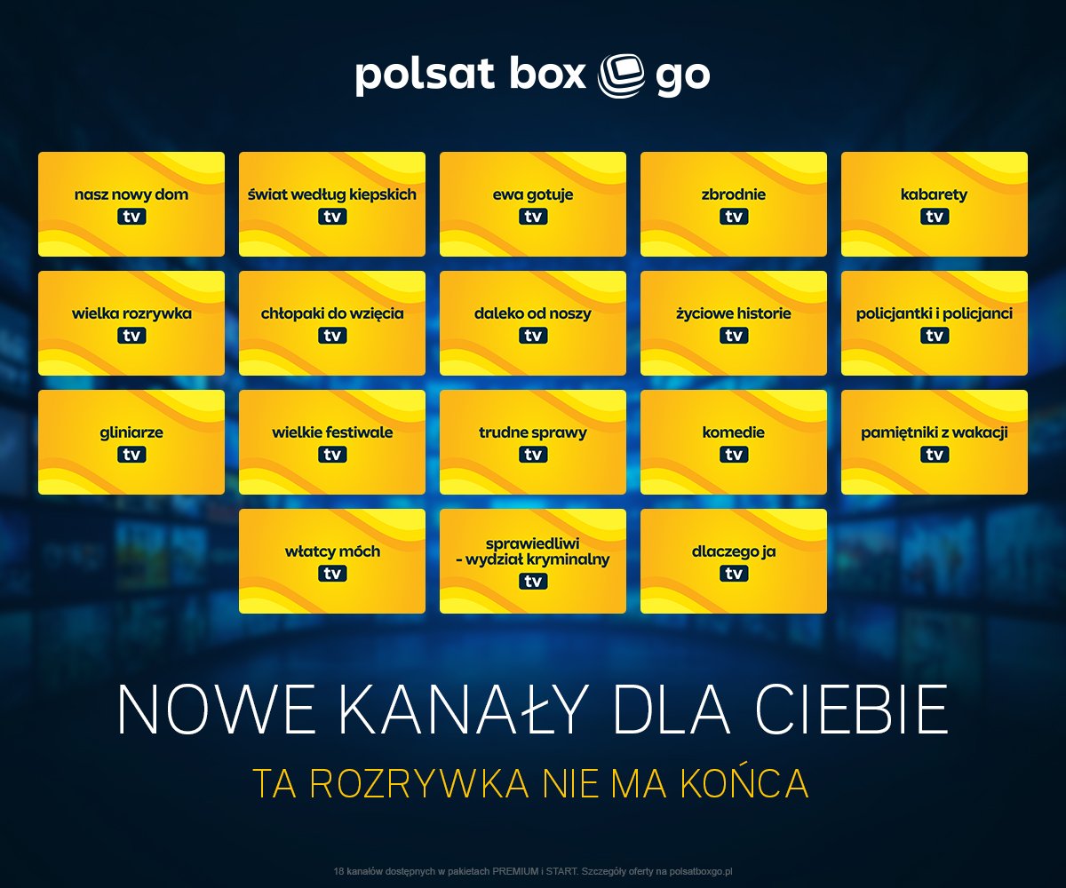 W serwisie Polsat Box Go zostało uruchomionych 18 kanałów internetowych typu FAST. Nowe stacje z najpopularniejszymi produkcjami Telewizji Polsat wzbogaciły pakiety Start oraz Premium. Za sprzedaż i obsługę reklam w tych kanałach odpowiada Polsat Media.
