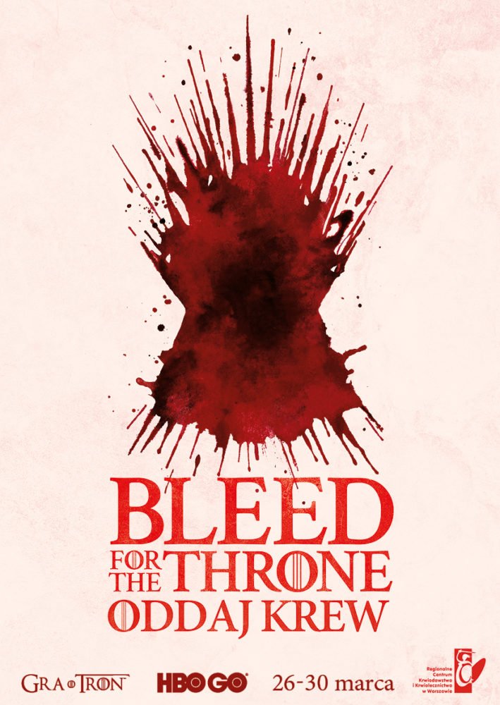 26-30 marca w Warszawie HBO oraz Regionalne Centrum Krwiodawstwa i Krwiolecznictwa w Warszawie zapraszają do wzięcia udziału w akcji krwiodawstwa Bleed For The Throne – oddaj krew! Z okazji nadchodzącej premiery ostatniego sezonu kultowego serialu HBO Gra o tron, widzowie zachęcani są do okazania swojego zaangażowania i jednocześnie zrobienia czegoś dobrego dla innych. 26, 27, 28 oraz 30 marca w Warszawie wszyscy chętni będą mogli oddać krew i odebrać unikatowe gadżety serialowe Gry o tron. W sobotę, 30 marca została przewidziana dodatkowa atrakcja – Żelazny Tron w Arkadach Kubickiego pod Zamkiem Królewskim w Warszawie.