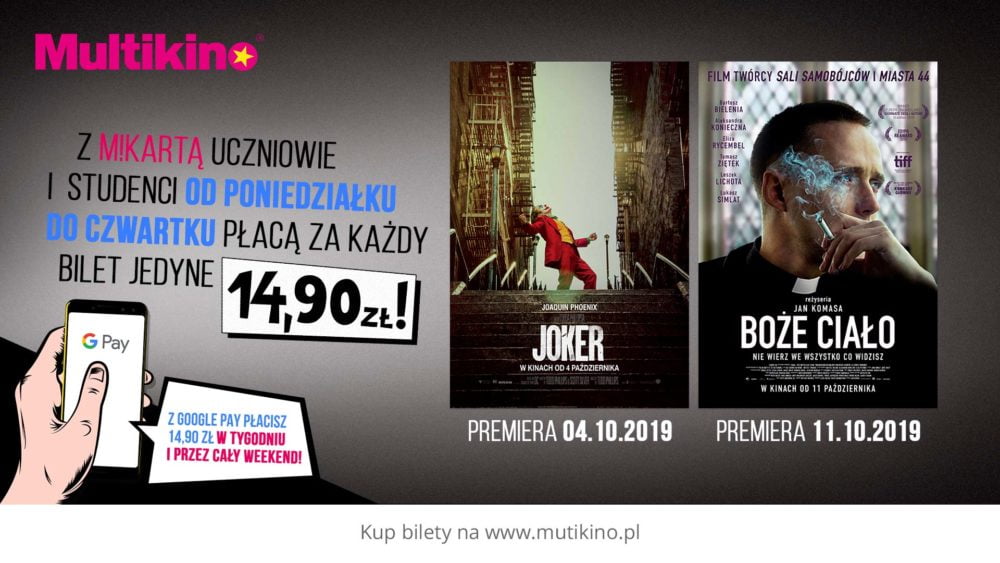 W sieci Multikino z M!Kartą uczniowie oraz studenci za bilety od poniedziałku do czwartku na wszystkie seanse 2D z repertuaru Multikina zapłacą jedyne 14,90 zł, a płacąc Google Pay cena obowiązuje również w weekend.