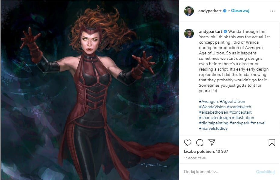 Wanda Maximoff czyli Scarlet Witch, zadebiutowała w filmach MCU podczas Avengers: Czas Ultrona. Z racji coraz bliższej premiery serialu o tej postaci, Andy Park, dyrektor ds. Rozwoju Wizualnego Marvel Studios, opublikował na swoim Instagramie post. Znajdowała się tam pierwsza w historii MCU, grafika koncepcyjna głównej bohaterki WandaVision.