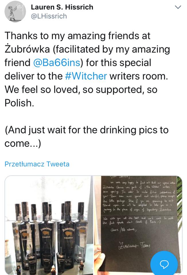 Showrunnerka Wiedźmina, Lauren S. Hissrich otrzymała ciekawe wsparcie twócze od samej Żubrówki!