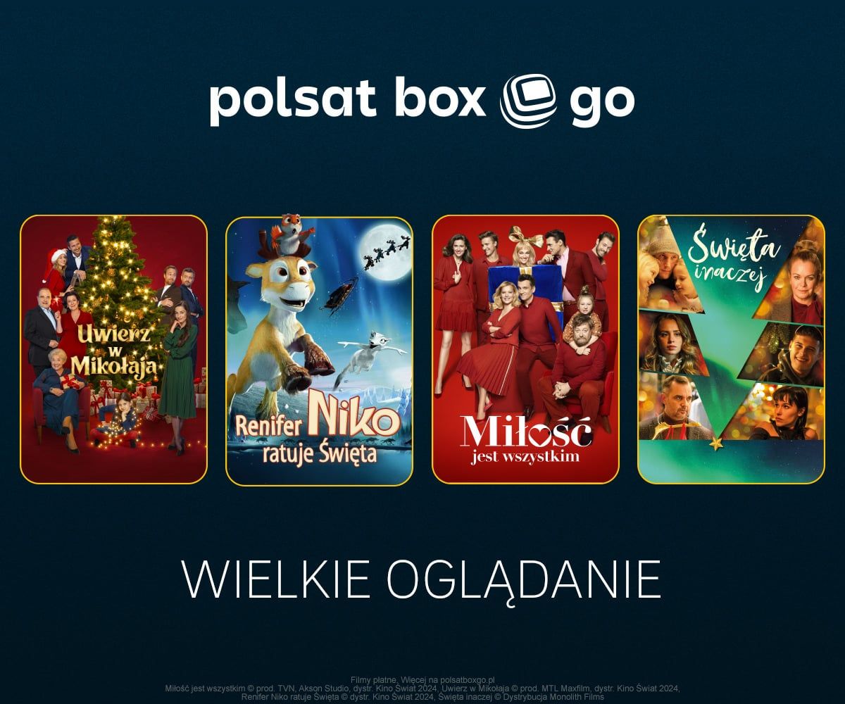 Z myślą o tych wyjątkowych chwilach, Polsat Box Go przygotował kolekcję tytułów, które idealnie wpisują się w różnorodne gusta widzów. Fanów dreszczyku emocji zainteresuje Randka w ciemno oraz mrożący krew w żyłach Terrifier 3. Z kolei miłośnicy rodzinnych i zabawnych opowieści mogą cieszyć się kolejnymi częściami ukochanej serii Listy do M. lub animacją Renifer Niko ratuje święta. Dla tych, którzy w święta szukają głębszych przeżyć, czekają międzynarodowe hity w Klubie Konesera, takie jak nagrodzony Złotą Palmą w Cannes The Square, poruszające Uniesienie czy mongolski kandydat do Oscara Gdybym tylko mógł zapaść w sen zimowy.