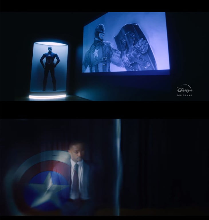 Trailer zaczyna się od sceny rozgrywającej się w izbie pamięci poświęconej Kapitanowi Ameryce. Widzimy tam jego kostium, plakaty, artykuły, różnego rodzaju zdjęcia. Ale najważniejszą sceną, jest ta symboliczna, gdzie widzimy Sama odbijającego się w szybie, w której umieszczona jest tarcza Kapitana. Falcon wie, jaki ciężar przekazał mu Steve Rogers w ostatnich scenach Avengers: Koniec gry.